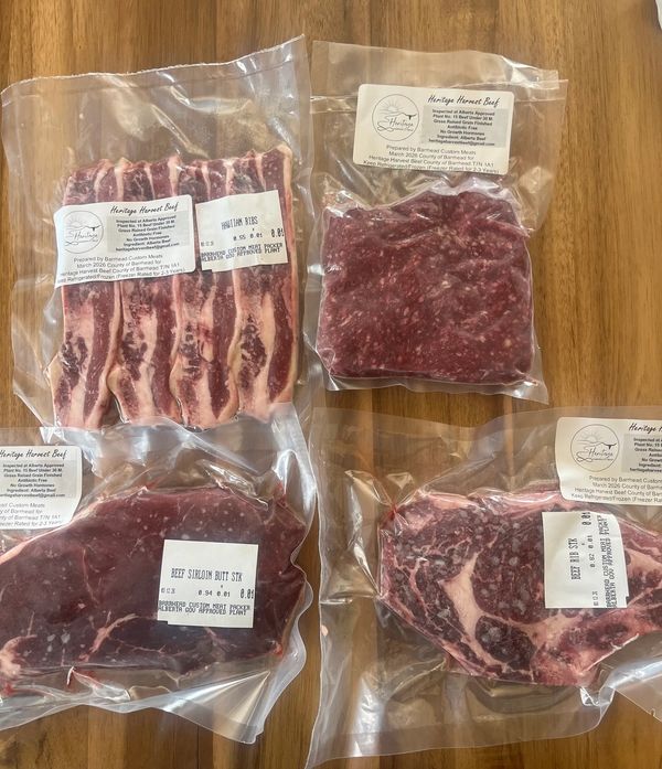 Premium Alberta beef, bundled up and sold by the pound. Freezer-ready. Go to our order form for more details. Inspected, Clean, Safe.